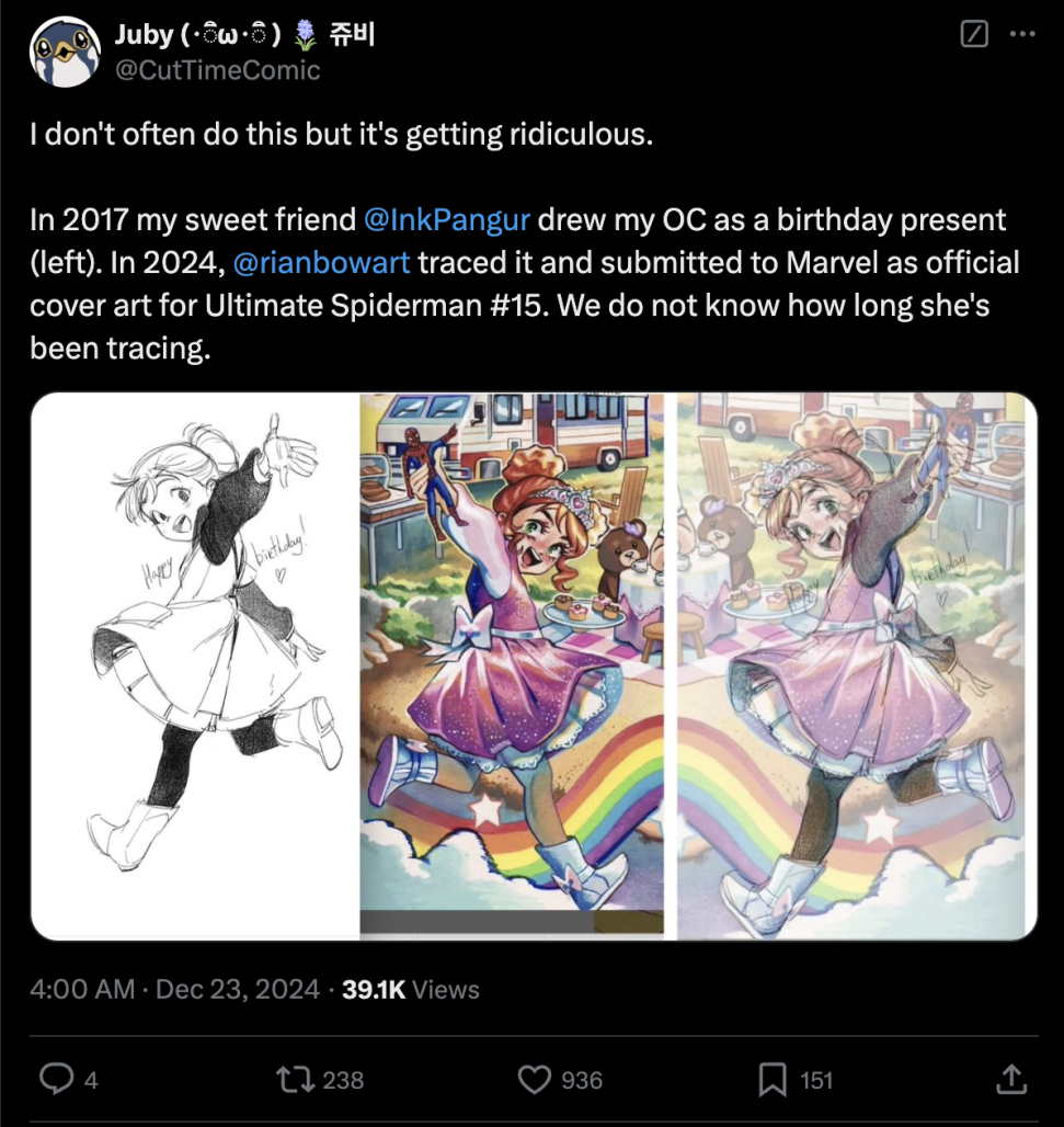 According to all parties involved, efforts were made to resolve this issue peacefully and offline. However, both Nina and Juby have raised concerns about the semantics surrounding the situation. Despite Gonzales’ claims to the contrary, the issue remains significant—largely because the artist denies tracing and insists they were only referencing, which blurs the lines further.
