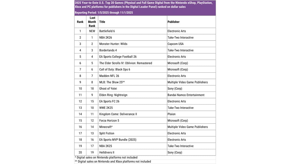 ‘Battlefield 6’ debuted as the No. 1 best-selling game of the month and 2025 to date. | Source: Circana