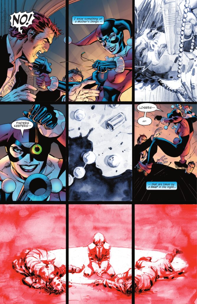 There are a couple of questionable design choices, in the new Killer Croc and Huntress’ belly costume, but by and large this story looks good. Lee’s interpretation of Catwoman’s Darwyn Cooke-designed costume is wonderful. Also, there is a great use of washes for flashbacks, which I actually find kind of reminiscent of Tim Sale’s work. Scott Williams maintains much of the scratchy, kinetic energy of Lee’s pencils with his inks. The crinkles and creases, the use of hatching, really informing the style.