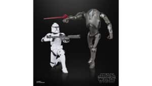 The first set is the Black Series Phase I Clone Trooper & Super Battle Droid. The six-inch figures come together and cost $39.99. They are ready for play and display with posable limbs, a removable helmet, and two blasters. This set is inspired by the film Star Wars: Attack of the Clones.