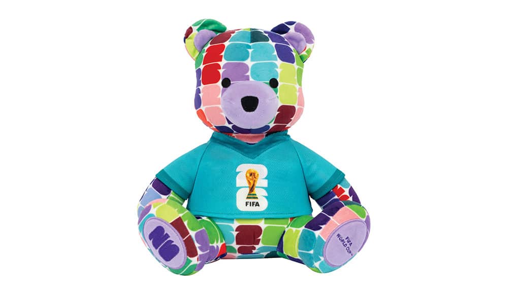 This 10-inch teddy bear plush has a colorful “26” pattern, a teal jersey featuring the FIFA Trophy logo and “26” on the back, and “FIFA World Cup” embroidered on its foot.