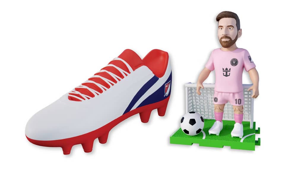 Each soccer cleat capsule contains a 3-inch soccer player with six points of articulation. The collectible figure also comes with a connectible field base, a player-specific accessory, a mini poster, and two stickers.