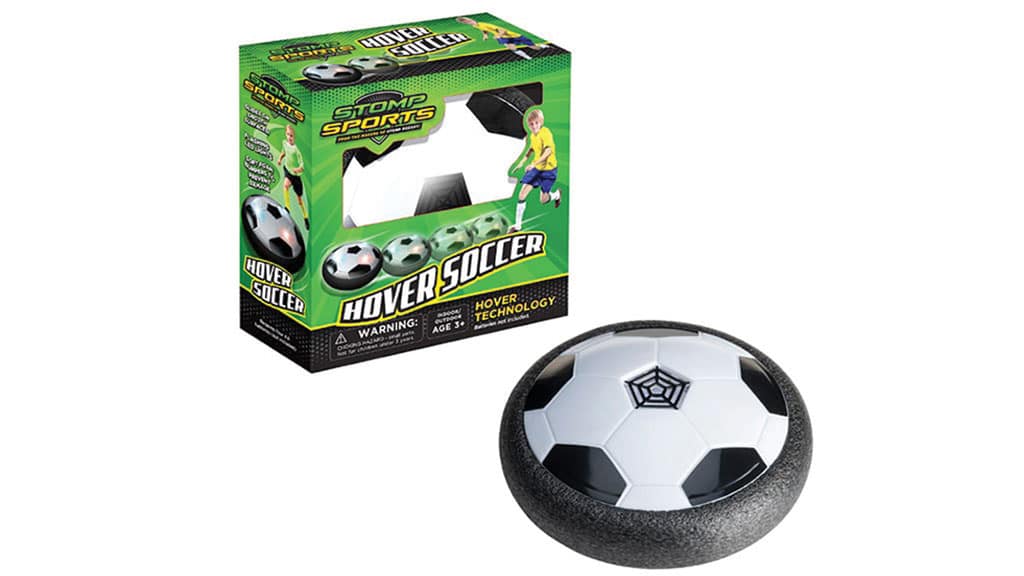 This soccer toy features LED lights, soft bumpers, and hover technology; it glides smoothly across surfaces when kicked.
