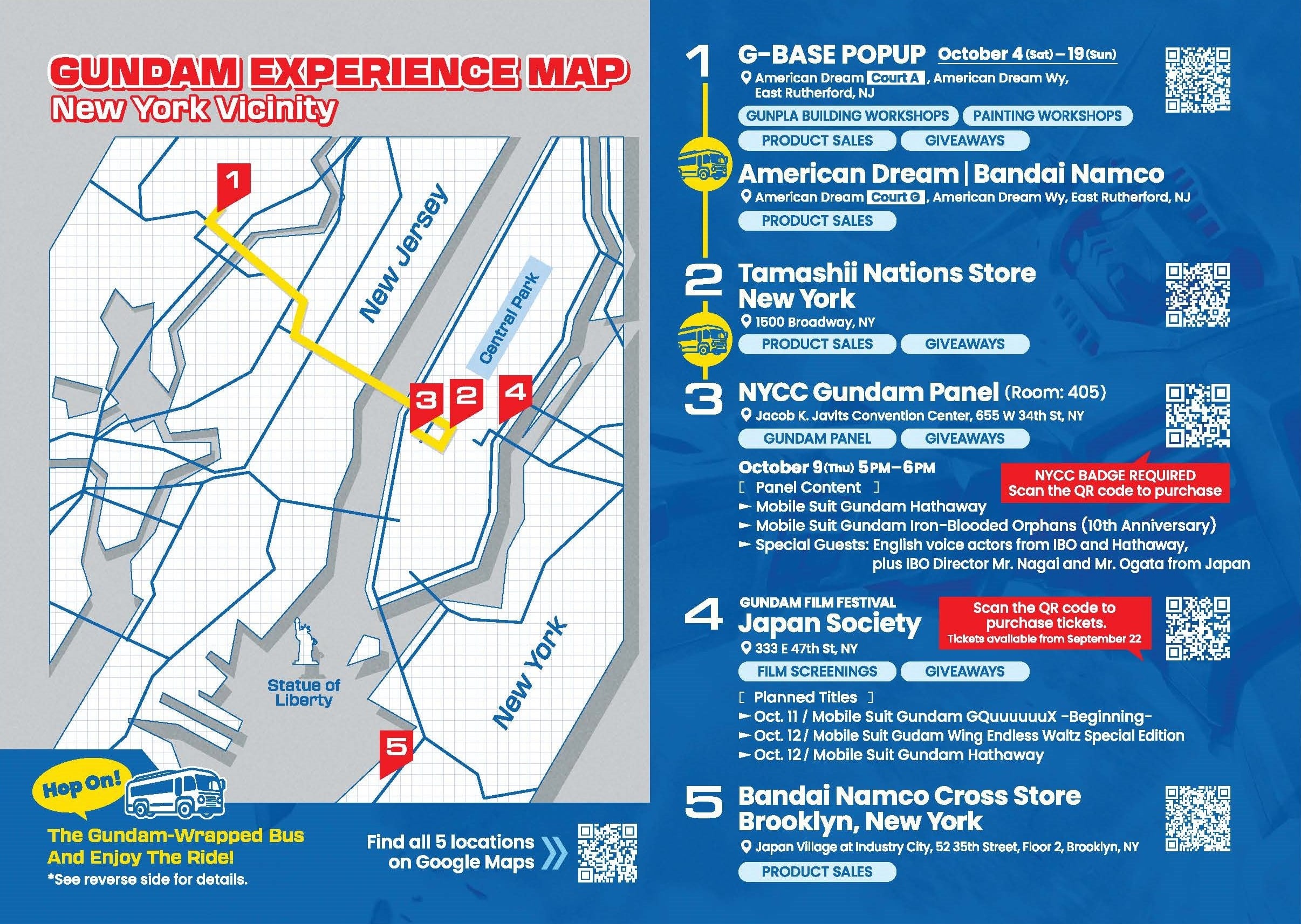 From September 28 to October 12, 2025, specially wrapped Gundam buses will traverse the streets of NYC, with select routes offering free rides. Fans riding these buses will experience Gundam in a city-wide activation like never before.