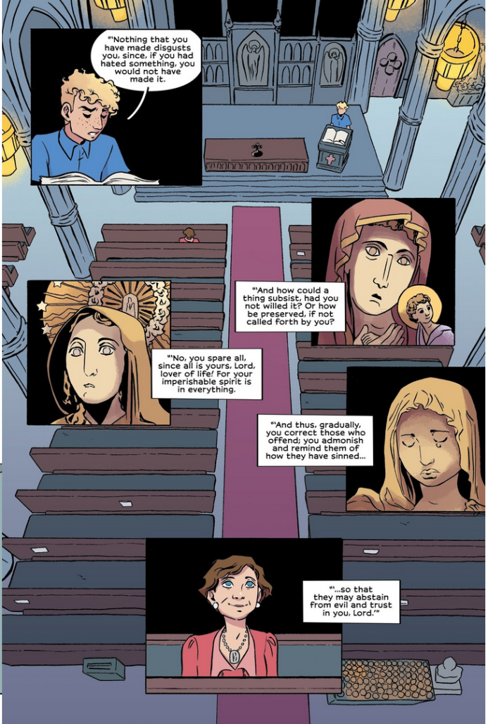 Rye Hickman’s art brings the story to life with dramatic imagery. Hickman does not ape any religious style but draws on Catholic iconography, capturing its sense of grandeur and awe of Catholic through evocative layouts, including wide open shots of churches intercut with close up details. One page depicting various interpretations of the Virgin Mary made me literally gasp. It is a stunning reminder of the complex, universal, and personal power of religious imagery. That evocation of Catholic tradition is part of the book’s structure itself, with chapters built around the Stations of the Cross and header imagery that deliberately echoes the passion of Jesus Christ. In this way, Wheeler and Hickman link the human struggle of betrayal, belonging, and acceptance to the divine.