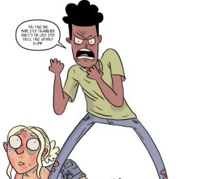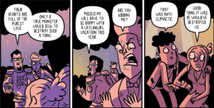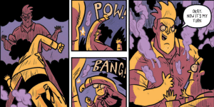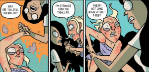 Chris Schweizer and Liz Trice Schweizer are frequent collaborators of Starks and it shows as they each complement each other so well. First example is the coloring technique.  I really enjoyed the cel-shaded technique that is used in this book.  With an art style that emphasizes simplicity and energy over detail, it is critical for the cel-shading to give the figure the form. Second example of the complementary nature of their work is the Schweizers’ color palate as it fits the tone of story moments as the book shifts to emotional tones. For example, the prom scene is draped in purple hues that is accented with pops of yellow to convey the action on the page. Additionally, subtle blushing and other visual cues can be found throughout in this book as the Schweizers work in unison with Starks writing and art.
