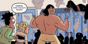 The action sequences are the centerpiece to Karate Prom, as one would imagine, and that’s where Starks’ kinetic style works wonders. The way he illustrates the brawls has the power of a grade school notebook. It looks rad as hell and just a delight to follow.