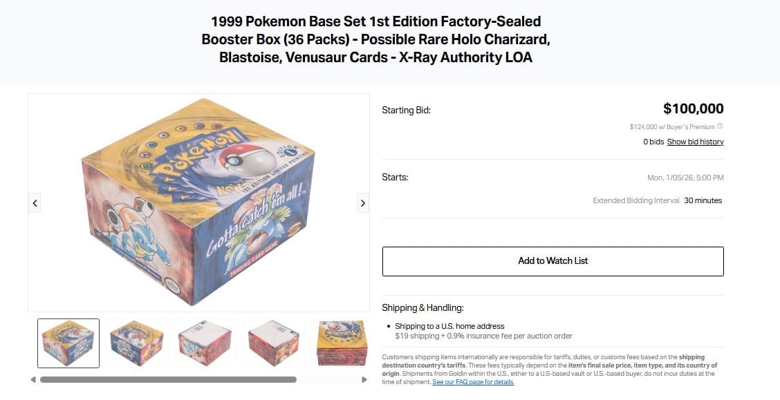 - a 1999 Pokémon Base Set 1st Edition Factory-Sealed Booster Box with potential for rare Charizard, Blastoise, and Venusaur cards