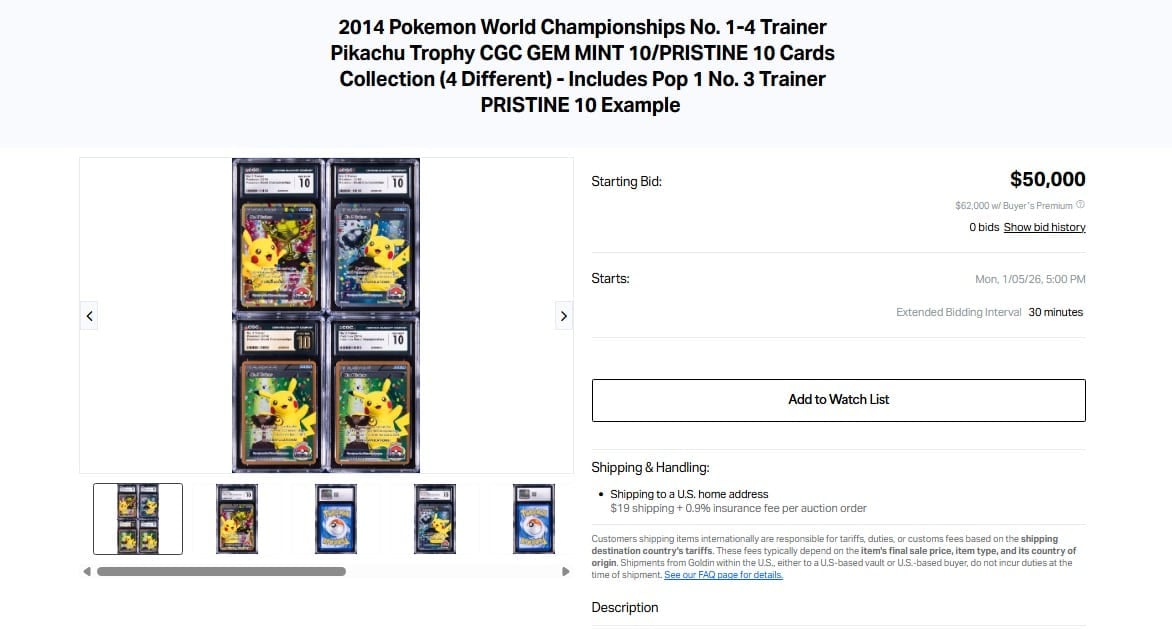 Goldin’s Pokémon & TCG Auction will open on Monday, January 5, at 8:00 p.m. ET, and will close on February 15, 2026 and will feature the Pikachu Illustrator PSA 10 card as well as some other rare cards from the set: