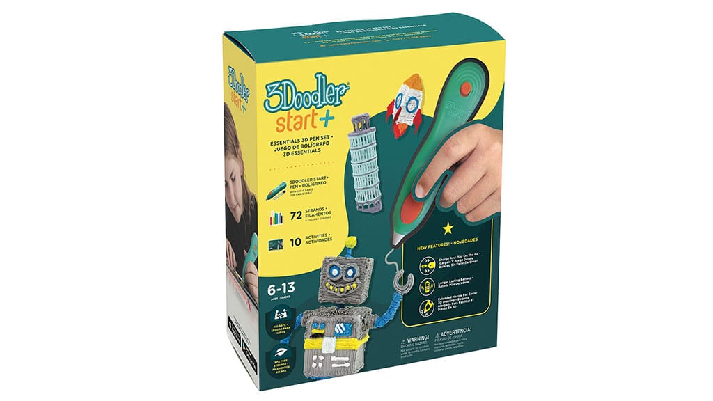 Doodle in 3D with the all‑new 3Doodler Start+, the original award‑winning kid-friendly pen, now with extended battery life, dedicated reverse button, removable hatch, and seamless charge‑and‑play functionality.