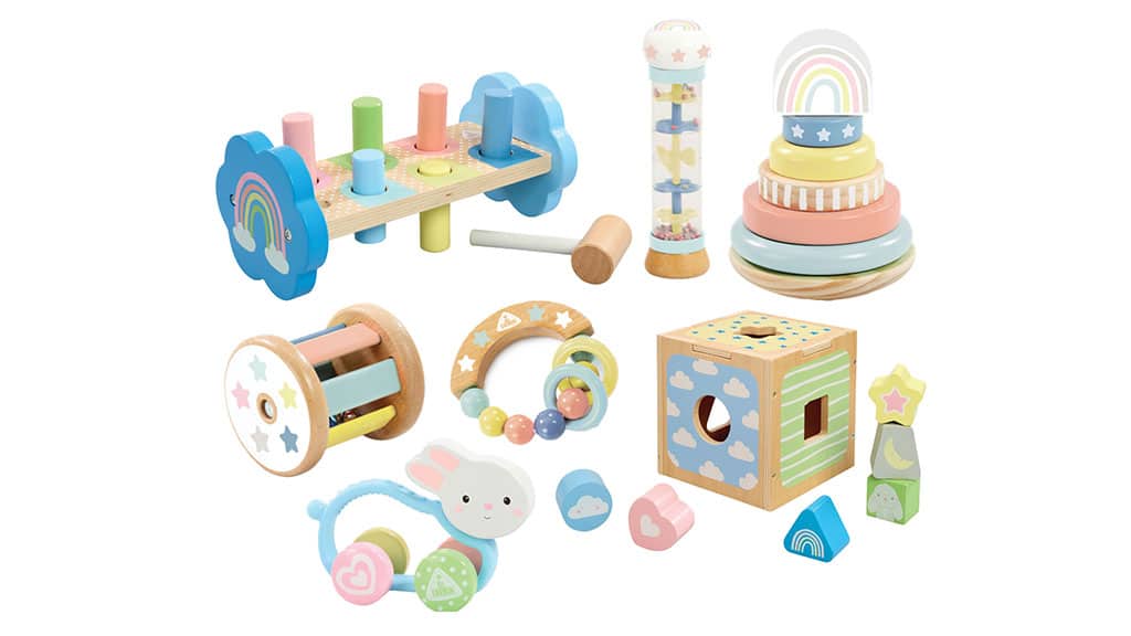 This wooden playset, which includes seven engaging pastel-colored toys, will enhance little ones’ coordination and development skills.