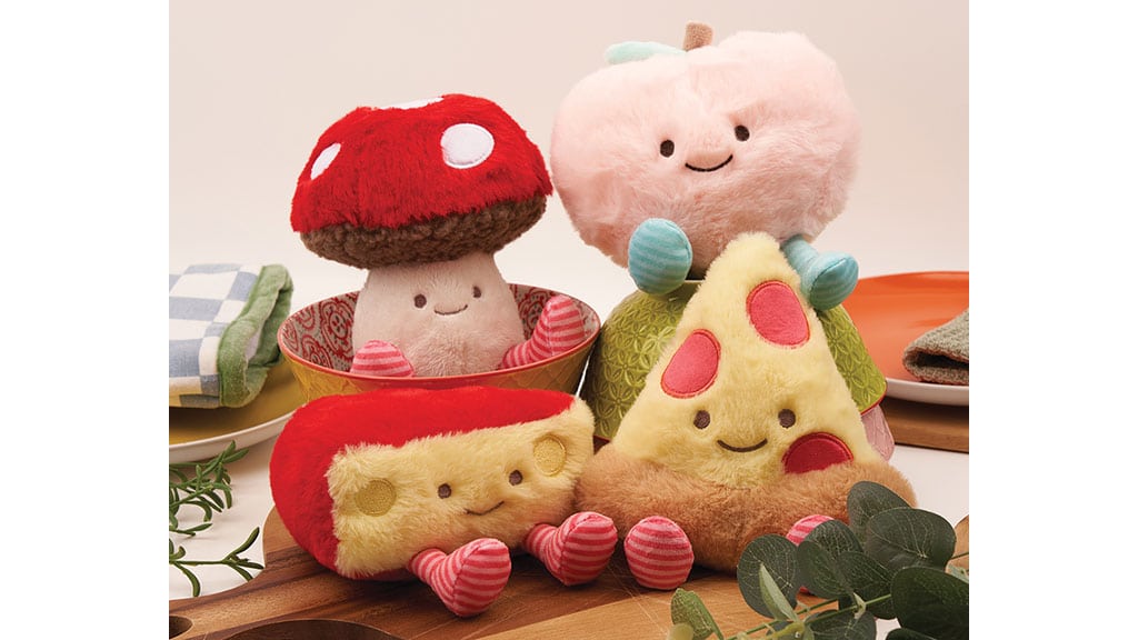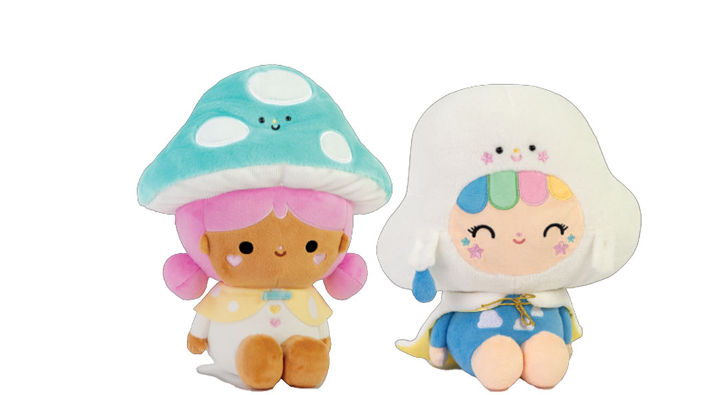 This soft, snack-inspired plush line features eight collectible characters, including a cupcake, mushroom, pizza, and more. Each plush features embroidered smiles and dangling legs, and is designed for cuddling, gifting, and display.