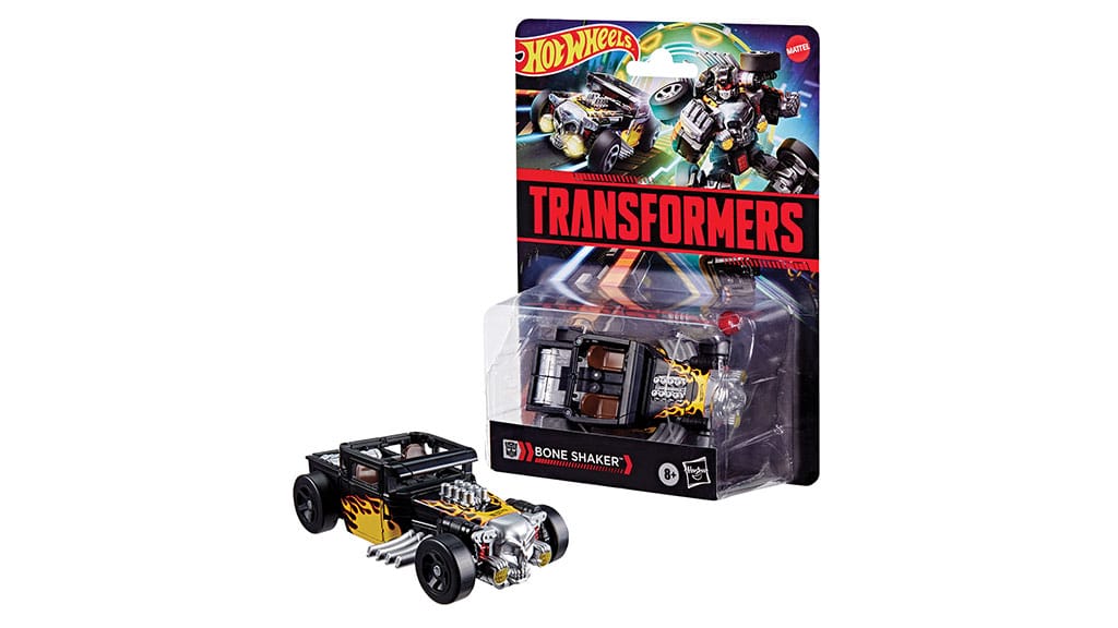 The epic worlds of Hasbro’s Transformers robots and Mattel’s Hot Wheels cars collide with a pair of 5-inch robot action figures that convert into cars. Kids and collectors can choose from Bone Shaker (pictured) or Twin Mill.