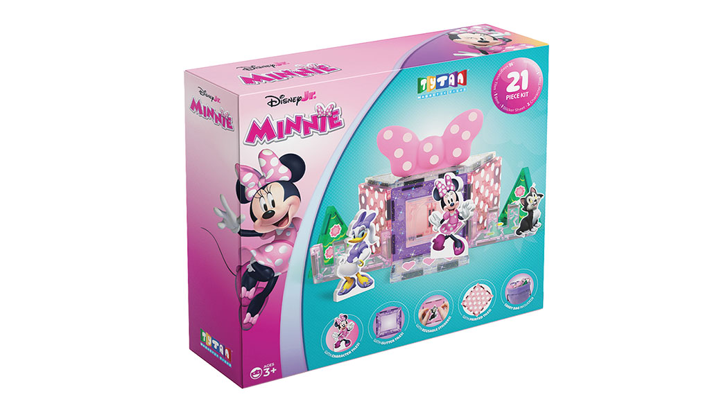 Kids can build and create with glitter and printed tiles, Minnie’s magnetic bow, and a reusable sticker sheet.