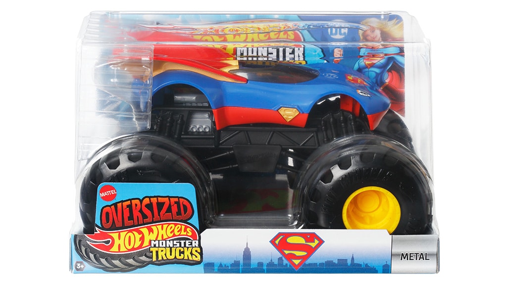 Crash, smash, and go into overdrive with giant wheels. The body of the truck features a Superman color way and his shield.