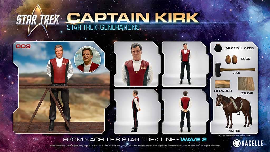 For Nacelle’s Star Trek line, the company revealed the second wave of the highly anticipated Star Trek action figure line, which includes ten new figures. Standouts include Captain Kirk from Star Trek: Generations, Romulan Commander from Star Trek: The Original Series, Geordi La Forge (Generations Sailor) from Star Trek: Generations, and Valeris from Star Trek VI: The Undiscovered Country. Captain Kirk’s action figure accessories were also debuted. His action figure will come with a horse, a jar of dill weed, some eggs, an axe, and logs — really all the space captain could ask for.