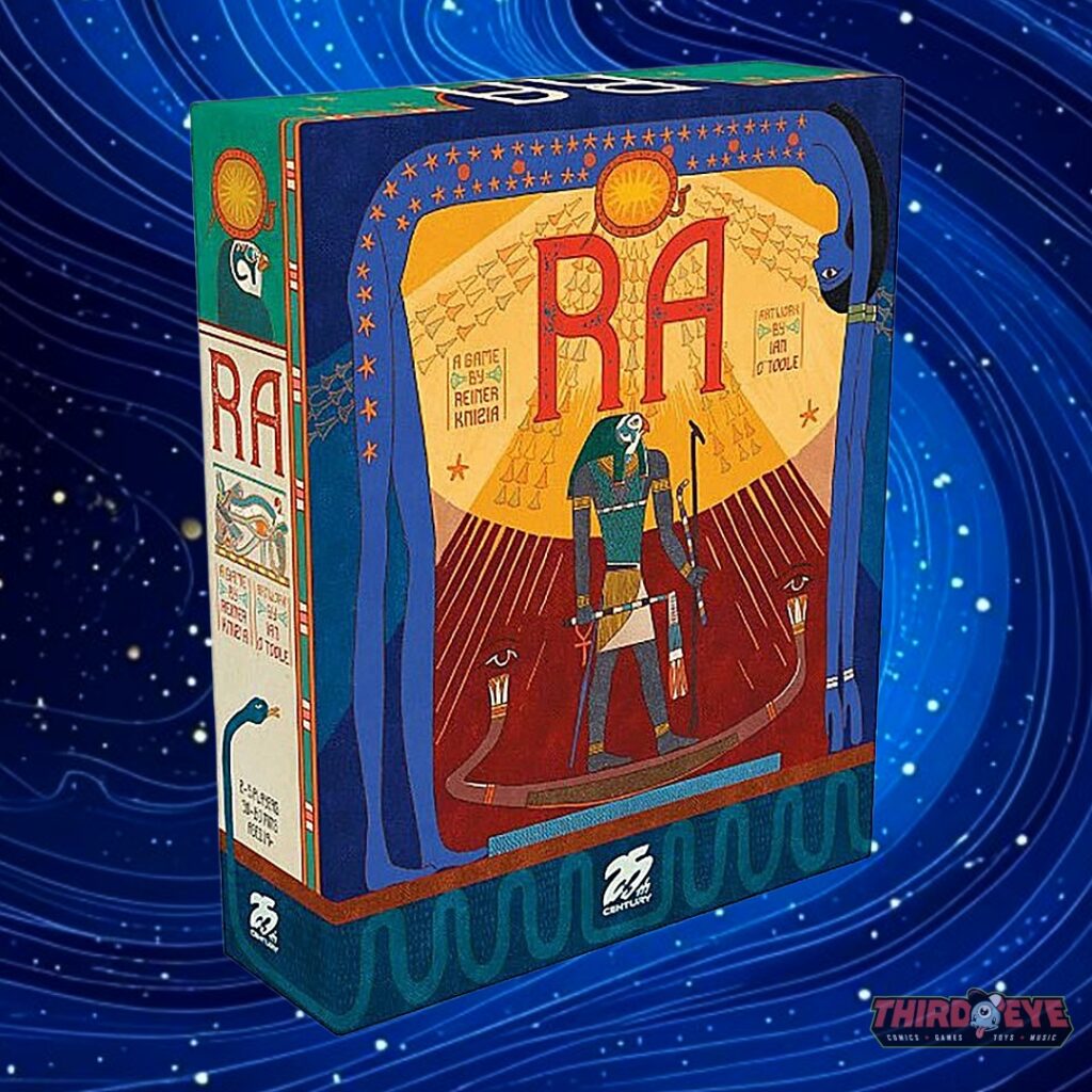 Spanning 1,500 years of Ancient Egyptian history in under an hour, Ra is a masterful auction and set-collection game filled with tension, timing, and tough decisions. Players compete to build the most powerful civilization by carefully bidding their precious Sun tiles to claim valuable lots of tiles as they appear. Each auction is a gamble. Monuments, Pharaohs, Nile floods, Gods, and advancements all score in different ways—some rewarding you immediately, others protecting you from penalties, and some only revealing their true value at the end of the game. Ra rewards clever timing, bold auctions, and the ability to read the table!!