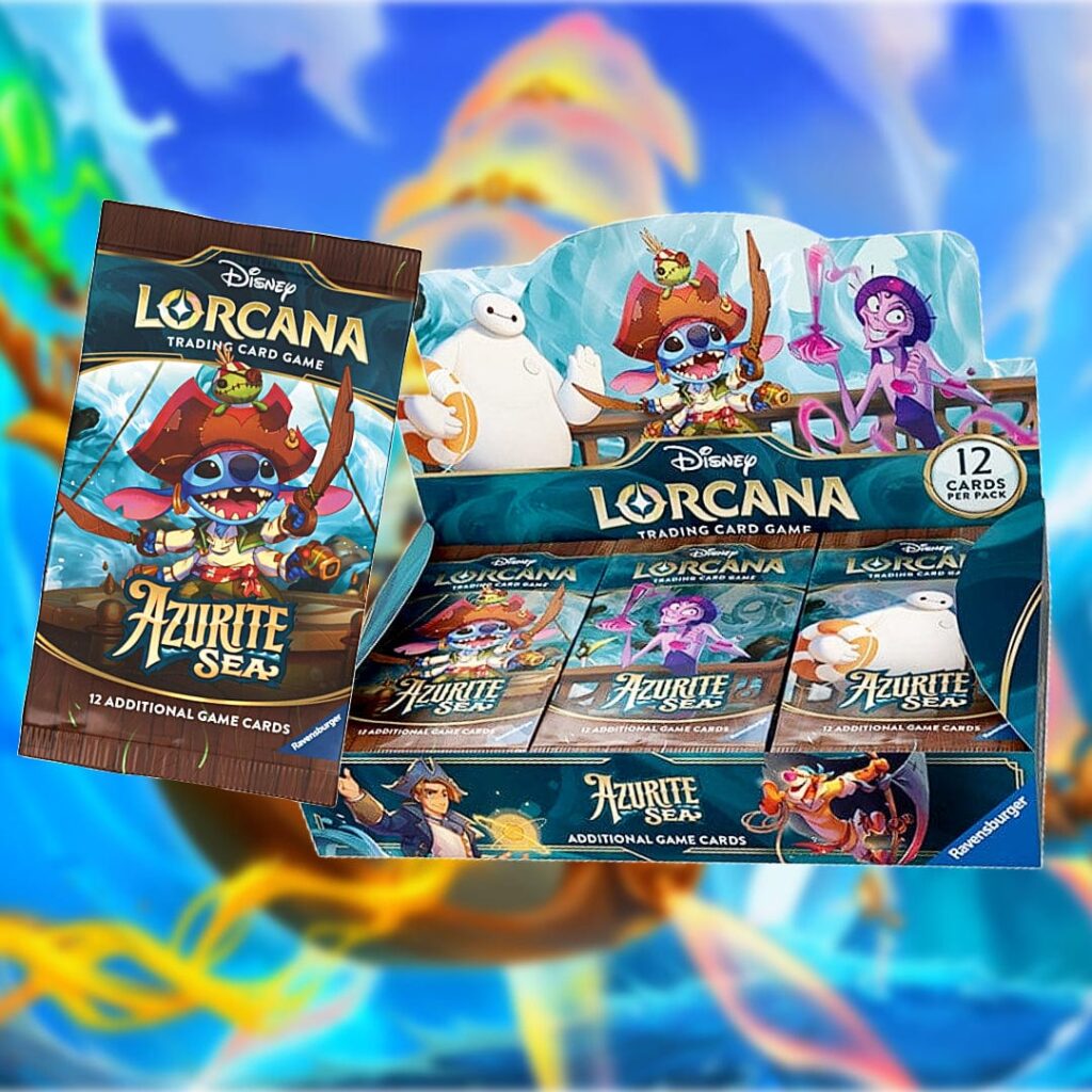 The sixth set of Lorcana takes place on the Azurite Sea where players must be prepared to set sail in a high-seas adventure full of treasures and pirates!! Even after the helpful repairs in Shimmering Skies there is much to be fixed in the Great Illuminary so many seafaring illumineers set sail looking for the owner of the hidden inkcaster uncovered in Ursula’s Return, who may have the skills available to teach them how to fix the Great Illuminary The awesome new set features characters from Big Hero 6 and Chip ‘n’ Dale: Rescue Rangers, and features pirate themed art work related to Stitch and Treasure Planet!! This Azurite sea is being released with a booster box, 2 types of starter decks (Amber & Ruby) (Emerald & Sapphire). Illumineer’s Trove and a gift set!!