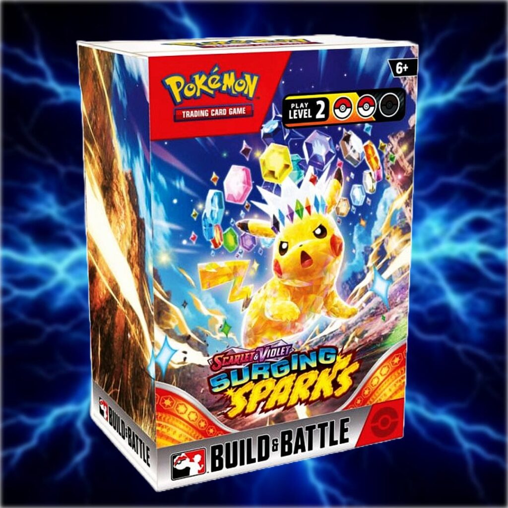 Jumpstart your Pokémon journey with the Surging Sparks Build and Battle Box! Terawatts of electricity crash down from the sky in a tropical paradise, setting the stage for the supercharged Pikachu ex and a parade of powerful dragons like Alolan Exeggutor ex, Duraludon ex, and Latias ex. Dive into battle with a pre-built 40-card deck featuring one of four exclusive foil promo cards, plus booster packs packed with potential—including new ACE SPEC cards and Stellar Tera Pokémon ex. Perfect for instant action or deck-building fun, the Surging Sparks expansion is a storm of stellar strength you don’t want to miss!!