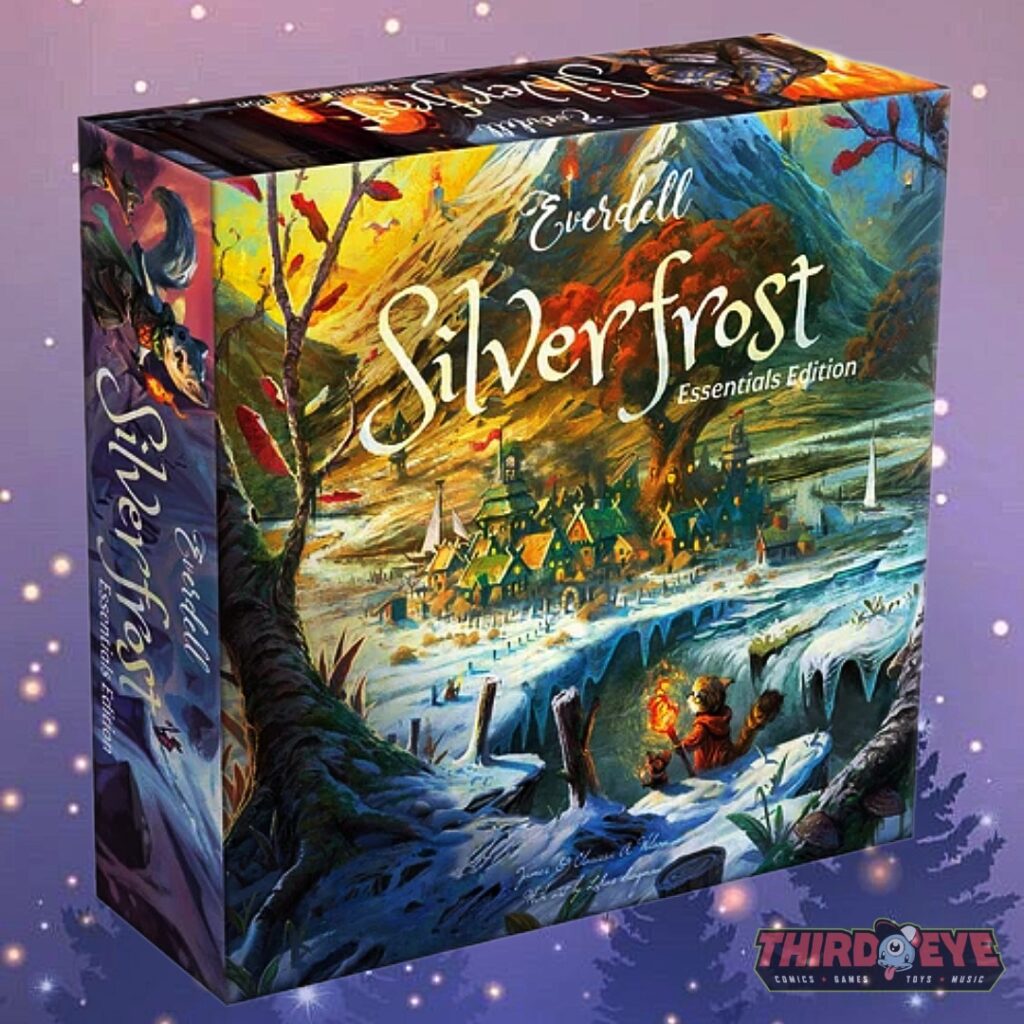 Discover Silverfrost, the resilient mountain country south of Everdell Valley, where critters must brave unforgiving winters and rely on the aid of towering Big Critters summoned by the glow of ancient Beacons. Everdell: Silverfrost – Essentials Edition delivers the full Silverfrost adventure at a more affordable price by replacing the Collector’s Edition resin components with premium punchboard pieces. Build your city amidst the snow, keep fires burning to protect your citizens, and take on quests from the Ranger’s Guild as you explore this new standalone entry in the Edge of the Map series. With rich, cozy art by Lukas Siegmon capturing the contrast between Silverfrost’s harsh climate and its warm, bustling critter communities, this is the perfect next chapter!!