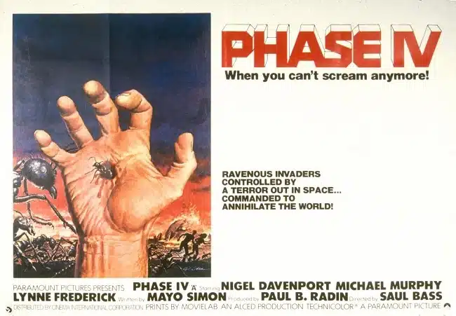 Saul Bass is the legendary graphic designer behind iconic movie posters such as Vertigo’s and The Shining’s. He’s also known for creating striking title sequences, with Hitchcock’s Psycho and North by Northwest among them. As to be expected from a creator of this caliber, Phase IV is a visual masterpiece that gives ants their due.