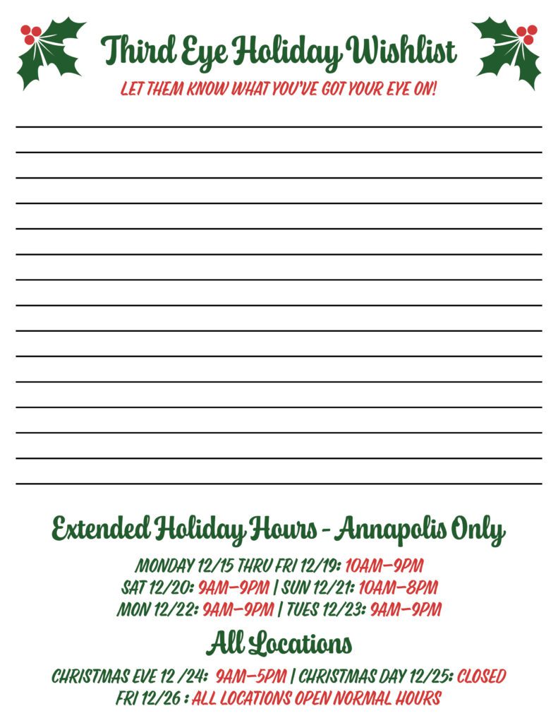 Grab a Third Eye Holiday Wishlist in-store, hand it to the nerd in your life, and let them fill it out. Then bring it back — we’ll help you find everything on the list.