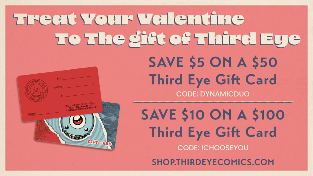First up is a returning fave – treat your Valentine to the gift of Third Eye with our gift card promo! Save $5 on the purchase of a $50 gift card or save $10 when you buy a $100 card! Make sure to use the discount codes if you want to snag them online!