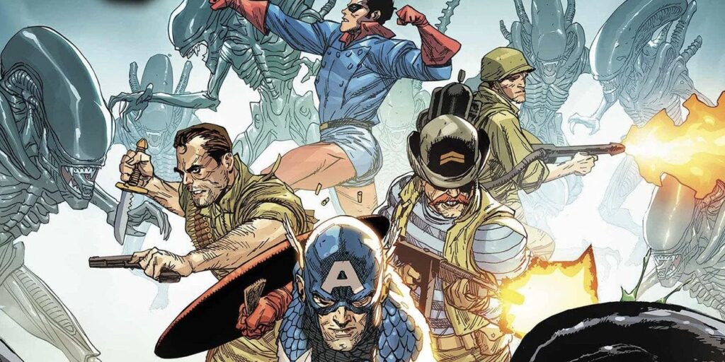 ALLIED, AXIS AND ALIEN POWERS COLLIDE! CAPTAIN AMERICA leads BUCKY BARNES and the rest of the HOWLING COMMANDOS behind enemy lines in order to free one of their own – but no-one is prepared for the horror they discover at HYDRA’S most top-secret base! Meanwhile, has RED SKULL managed to find a way to harness the destructive might of the XENOMORPHS, or has he merely added to the carnage and chaos of the warfront? Either way, Captain America and his allies are about to face their biggest fight yet – that is, unless an unexpected “alien” ally sees fit to intervene!