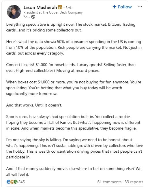 “I’m not saying the sky is falling. I’m saying we need to be honest about what’s happening. This isn’t sustainable growth driven by collectors who love the hobby. This is wealth concentration driving prices that most people can’t participate in.”